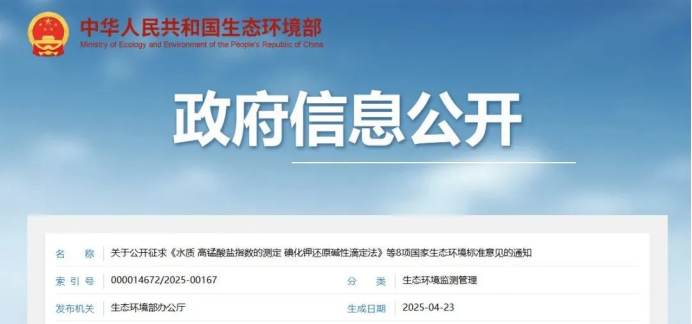 關于公開征求《水質 高錳酸鹽指數的測定 碘化鉀還原堿性滴定法》等8項國家生態環境標準意見的通知