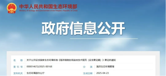 關于公開征求國家生態環境標準《海洋傾倒在線監控技術規范(征求意見稿)》意見的通知為貫徹落實《中華人民共和國海洋環境保護法》有關要求,規范海洋傾倒在線監控設備安裝與使用,加強廢棄物海洋傾倒監督管理,我部組織編制了《海洋傾倒在線監控技術規范(征求意見稿)》,現公開征求意見。征求意見稿及其編制說明可登錄我部網站(http://www.mee.gov.cn)“意見征集”欄目檢索查閱。