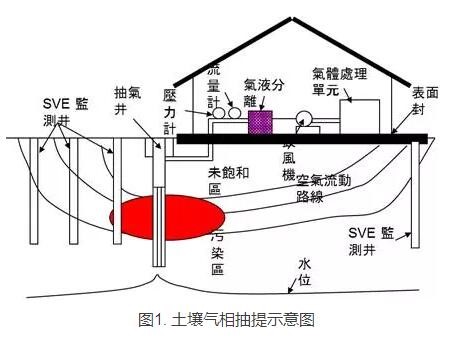 土壤氣相抽提(Soil Vapor Extraction, SVE)是1990年代初期所發展的一項成熟的土壤原位修復技術。SVE的基本原理是通過專門的地下抽提(井)系統,利用抽真空迫使非飽和區土壤中的氣體發生流動,從而將其中的揮發性有機污染物脫除,達到污染土壤修復的目的。有時在抽提的同時,可以設置注氣井,人工向土壤中注入空氣。典型的SVE技術如圖1所示,包括注射井、抽提井、管道系統、控制系統和尾氣處理系統,根據現場污染情況抽提井可分為豎井和橫井兩大類。
