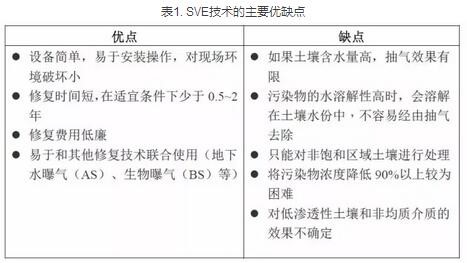 SVE是一項相對低廉的土壤修復技術,在修復過程中對地下水的擾動小,不破壞土壤結構、設備,且設計、安裝簡單,成本不高。然而,當土壤細粒物質含量高,含水率高時,修復效果相當有限、修復時間長,使修復費用增加;此外當土壤有機質含量高,其對有機物的吸附容量大,SVE去除效率也會降低。SVE的主要優缺點見表1。