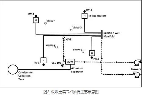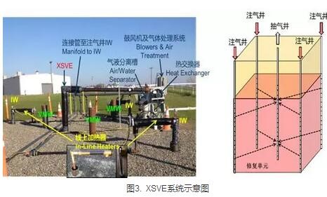 有鑒于SVE在上述問題的局限及缺點,永清環保公司所收購的美國Integrated Science &Technology, Inc. (IST) 公司于2014年研發極限土壤氣相抽提技術(Extreme Soil VaporExtraction, XSVE),這是傳統氣相抽提技術(SVE)的創新和拓展。由XSVE在傳統SVE的基礎上通過增加空氣流量、干氣流吹掃、提高土壤溫度、減少滲析、以及更具針對性的氣相抽提等手段,可以大大提高了有機污染物的去除率。XSVE的工藝示意圖見圖2。