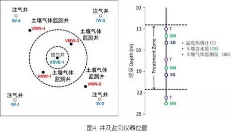 其中溫度感應器以及土壤濕度感應器是本系統的重點,因為溫度及土壤含水量的分布及變化趨勢將決定了修復成效。XSVE系統的裝置可見圖3,井及監測儀器位置見圖4。