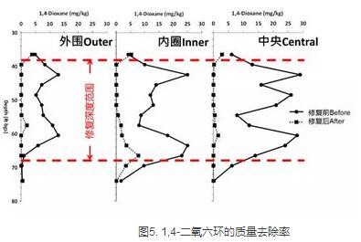 圖5顯示了XSVE修復前后的1,4-二氧六環在土層中的濃度變化情形,在修復區的中央,1,4-二氧六環由修復前的10-30 mg/kg降到了1 mg/kg以下;在距離抽氣井約3m的內圈范圍,1,4-二氧六環由修復前的10-25 mg/kg降到了2 mg/kg以下,只有在靠近地下水層的部分濃度稍微高些;在距離抽氣井約6m的外圈范圍,1,4-二氧六環也降到了1 mg/kg以下。